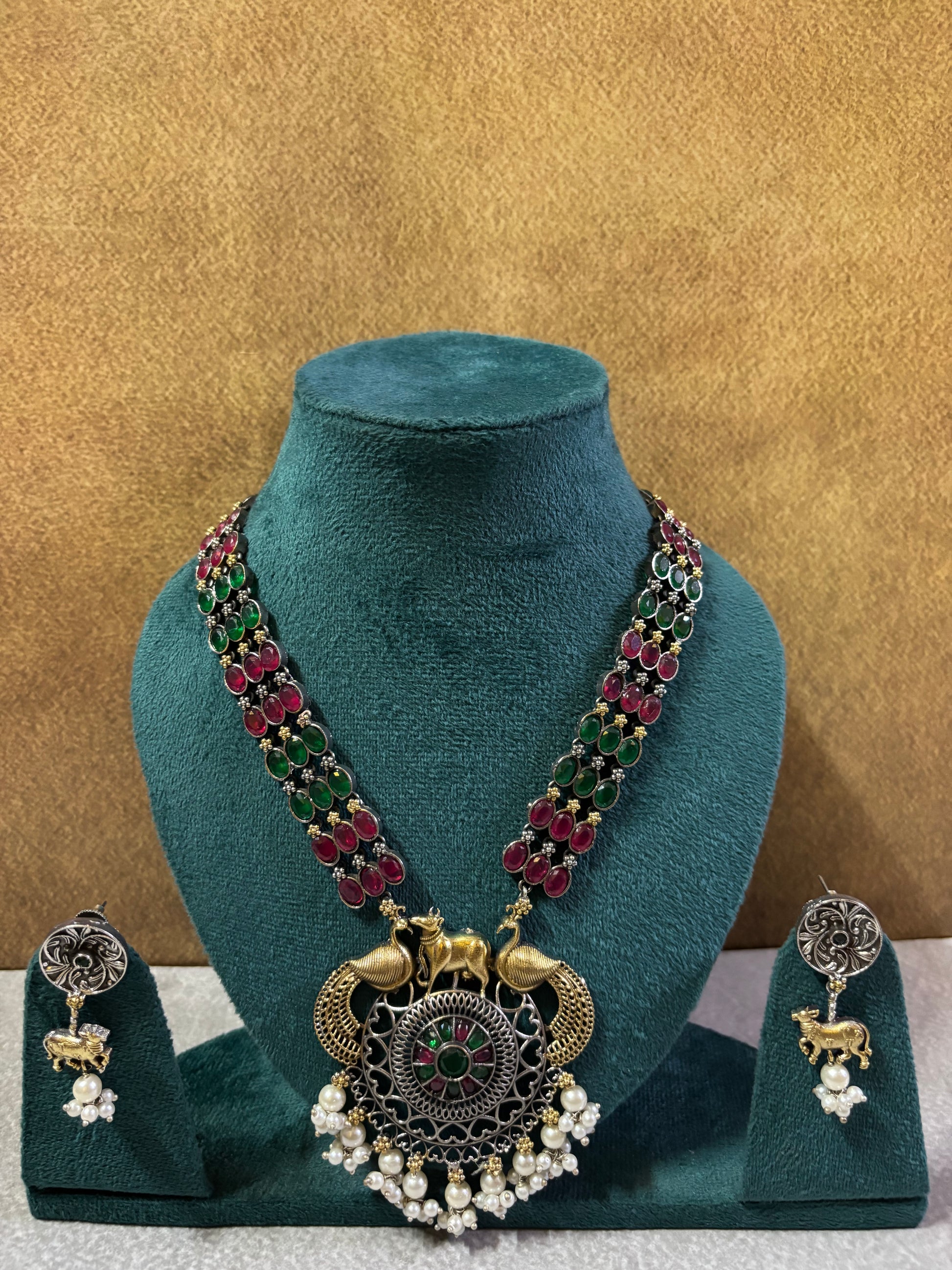 A masterpiece of traditional artistry, this dual-tone temple necklace features a stunning round pendant adorned with intricate peacock and cow motifs, symbolizing grace and prosperity. The pendant is surrounded by antique silver filigree work, highlighted with ruby-red and emerald-green stones, and finished with delicate pearl drop hangings for an elegant sway.