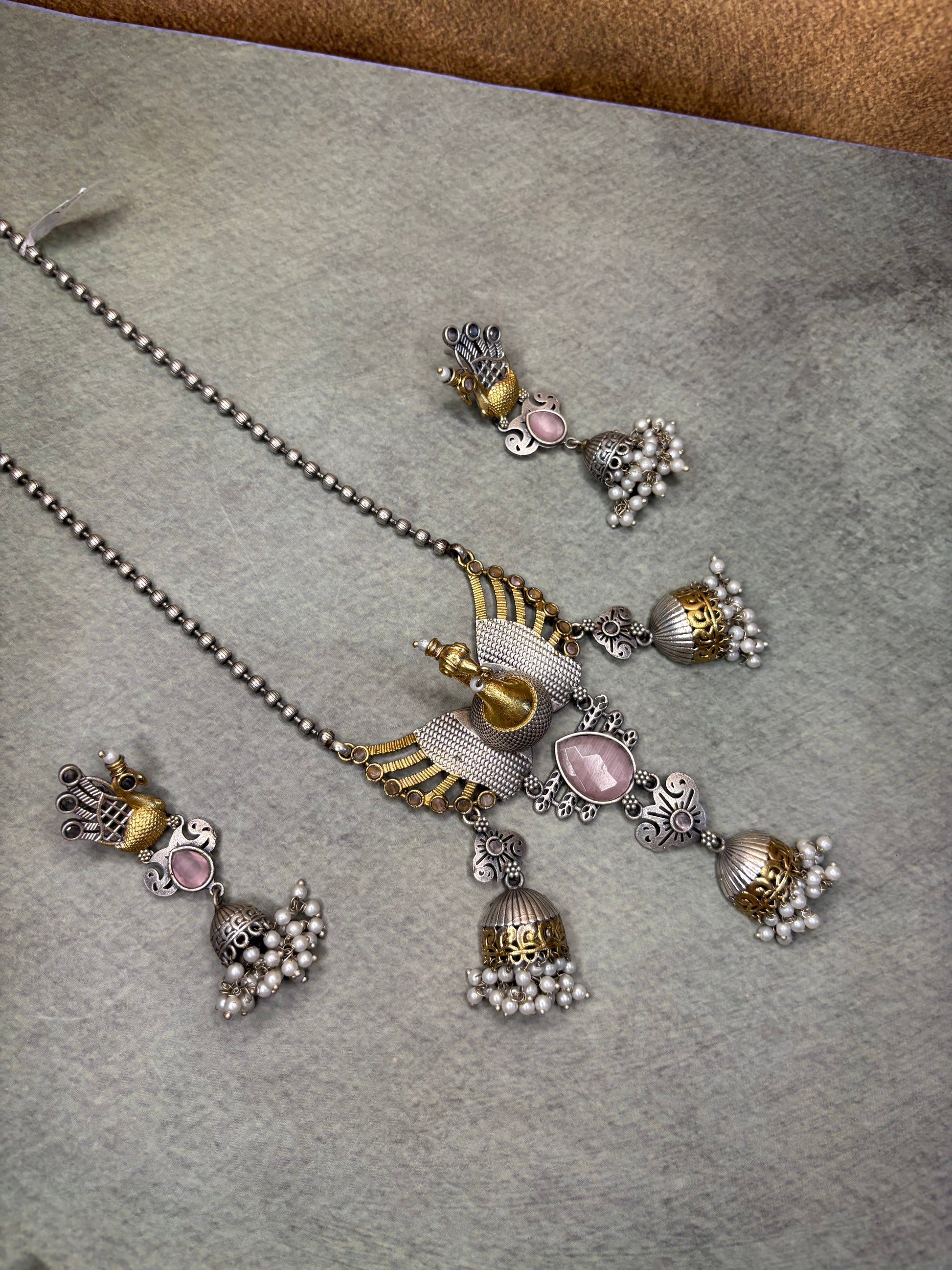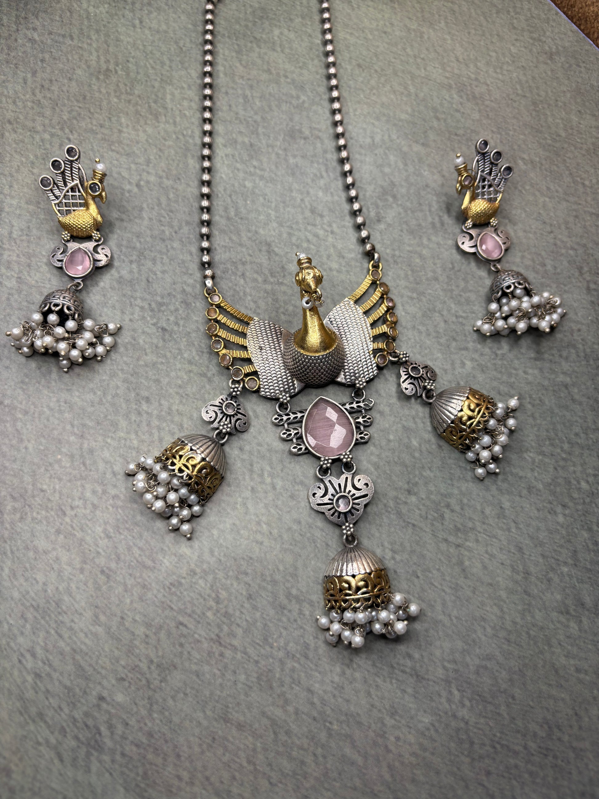 Turn heads with this premium handcrafted necklace set featuring intricate peacock motifs, antique silver-gold finish, soft pink monalisa stone accents, and classic pearl jhumkas. A blend of heritage and modern charm — perfect for festive celebrations, weddings, or statement everyday styling.