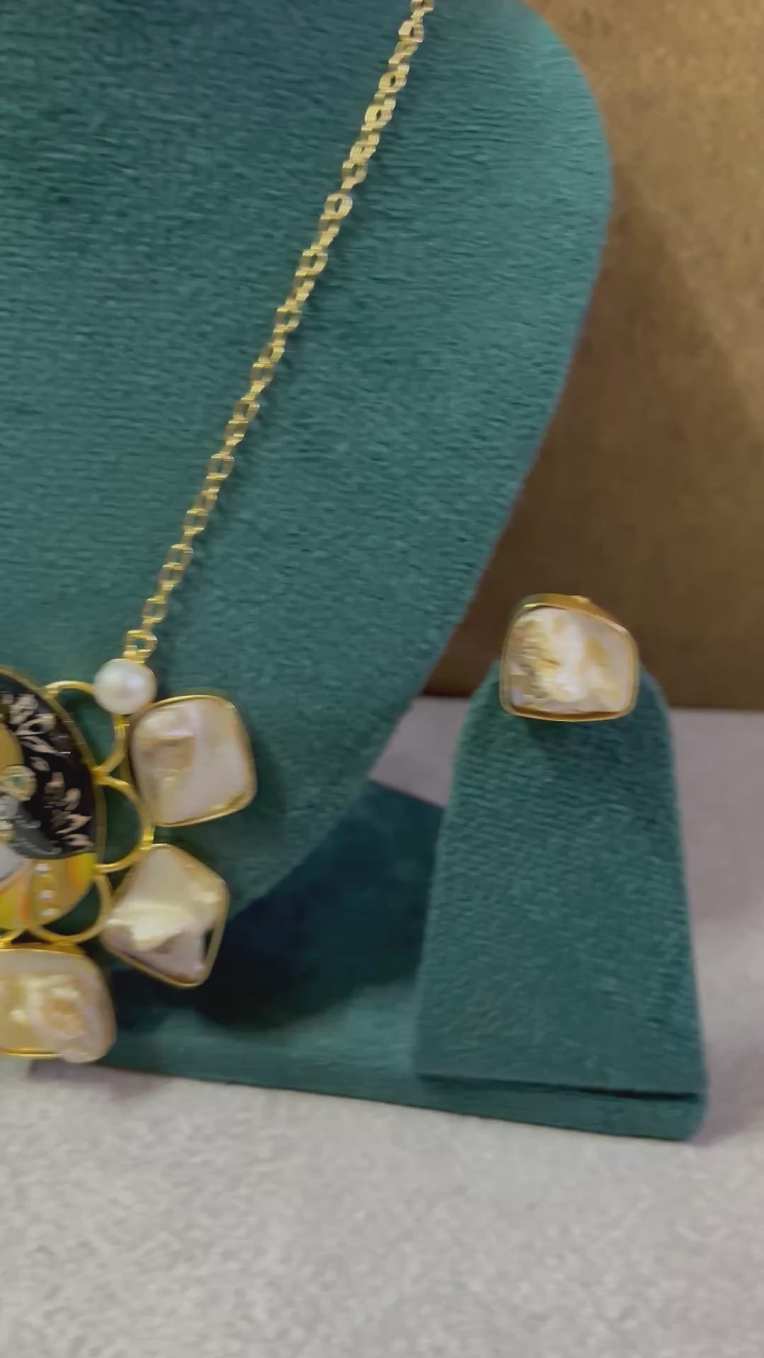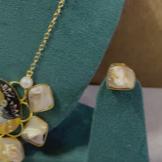 Gold-Tone Krishna Motif Necklace with Mother of Pearl Stones & uncut stone studs