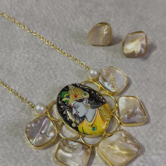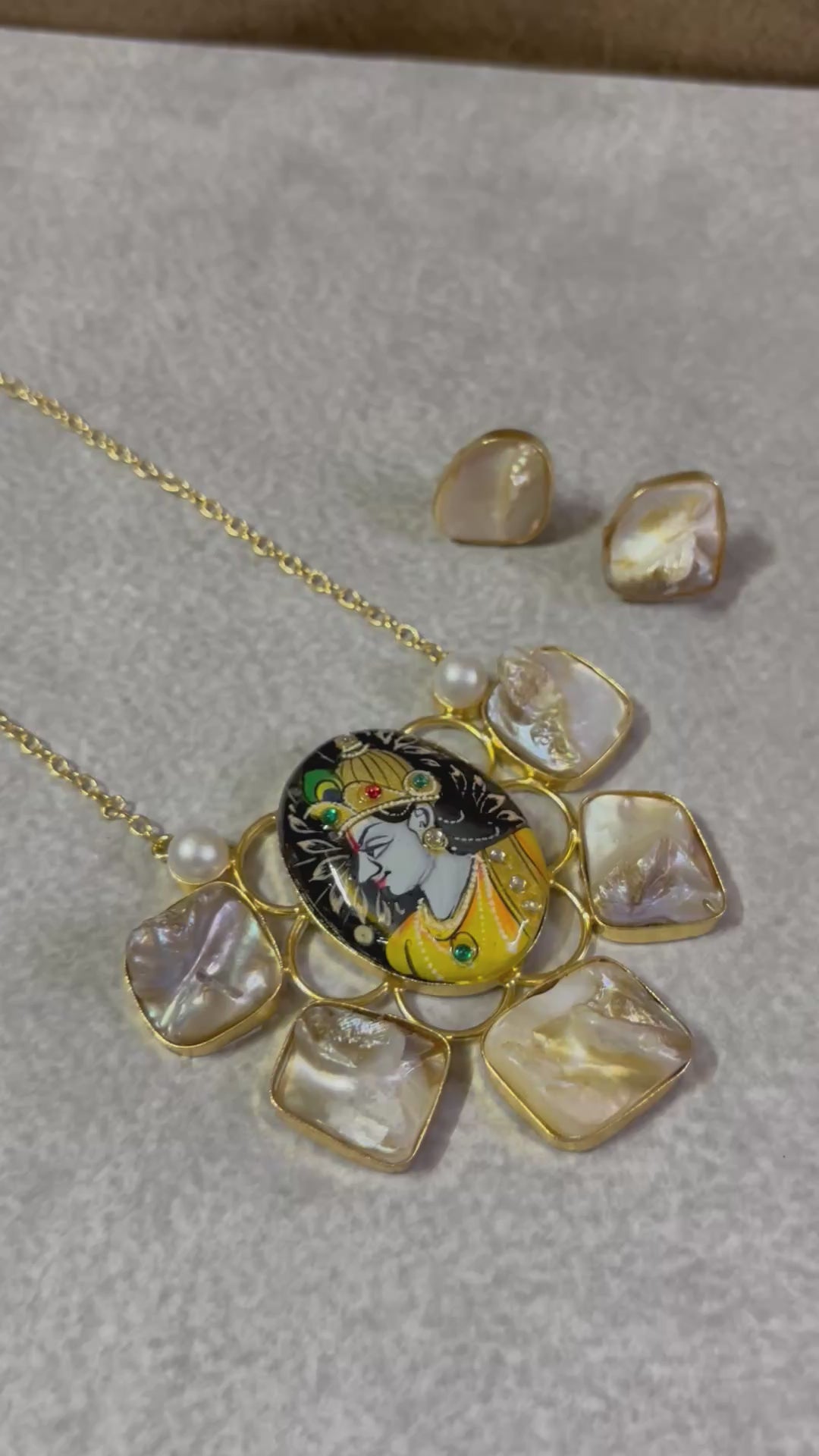 Radiating spiritual elegance, this gold-tone Krishna motif necklace set features a hand-painted Krishna pendant framed with lustrous Mother of Pearl stones and accented with deep red round beads. The unique design blends divine symbolism with contemporary aesthetics, making it equally suitable for festive wear or gifting.