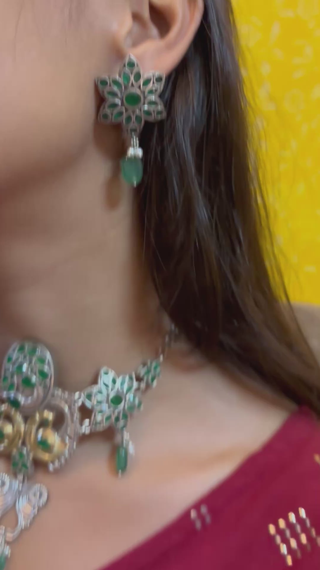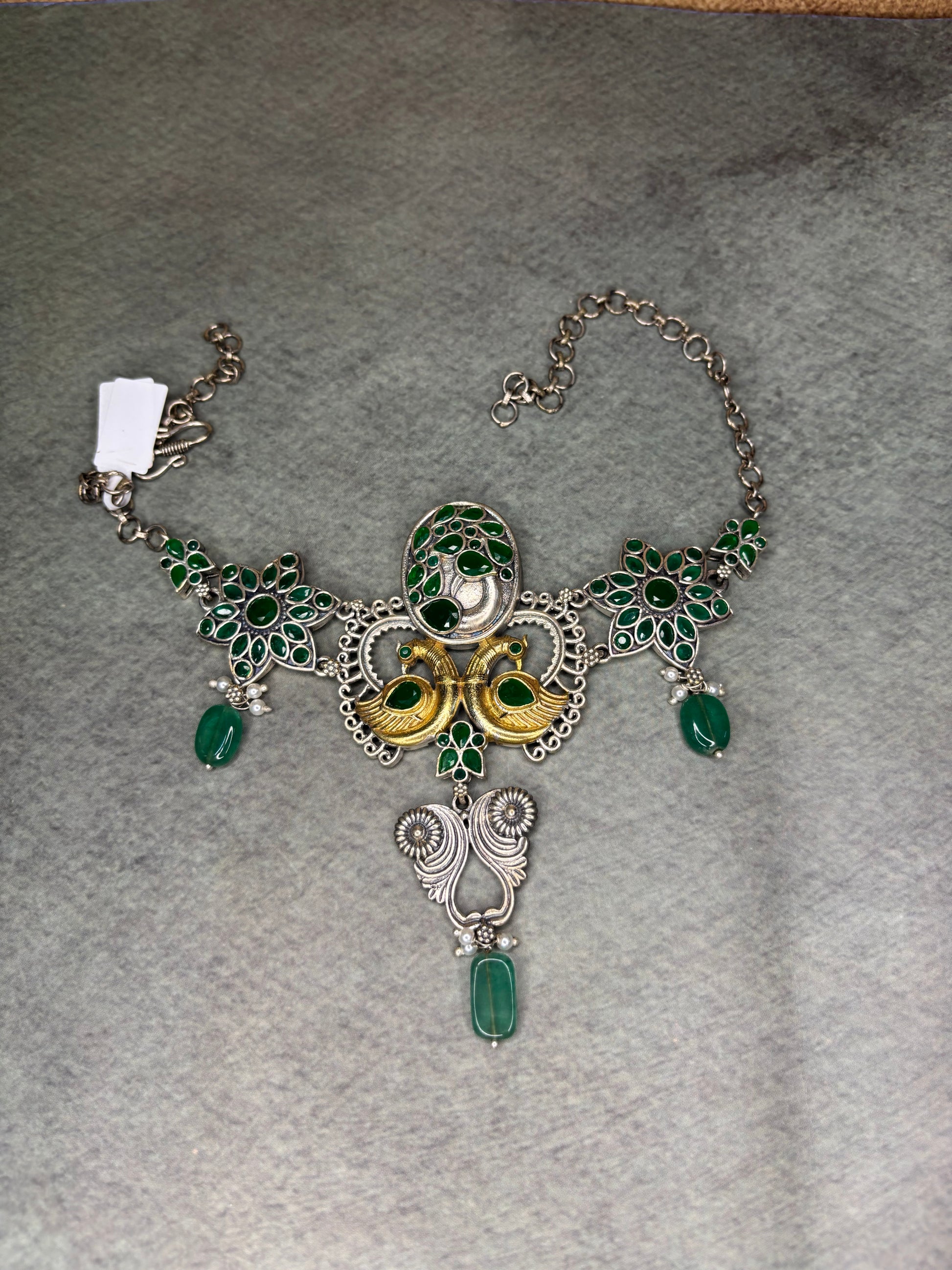 Elevate your festive look with this elegant green and gold choker set, crafted in premium brass with a silver replica finish. The necklace features intricate detailing highlighted with radiant green stones and golden accents, paired with matching earrings for a complete look. Perfect for weddings, festive occasions, and statement styling, this timeless piece adds a regal charm to any outfit.