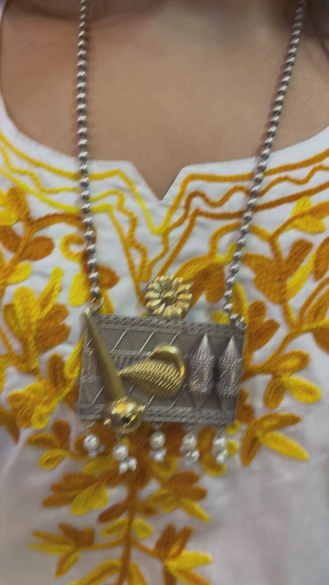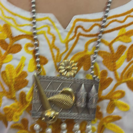 Elevate your ethnic charm with this stunning handcrafted tribal pendant. Featuring a striking golden bird motif set against an intricately carved silver-tone base, this statement piece beautifully combines tradition with artistry. The pendant is further adorned with dangling pearl beads, adding a graceful touch to your festive and everyday looks. A perfect choice for those who appreciate heritage-inspired jewellery with a modern edge.