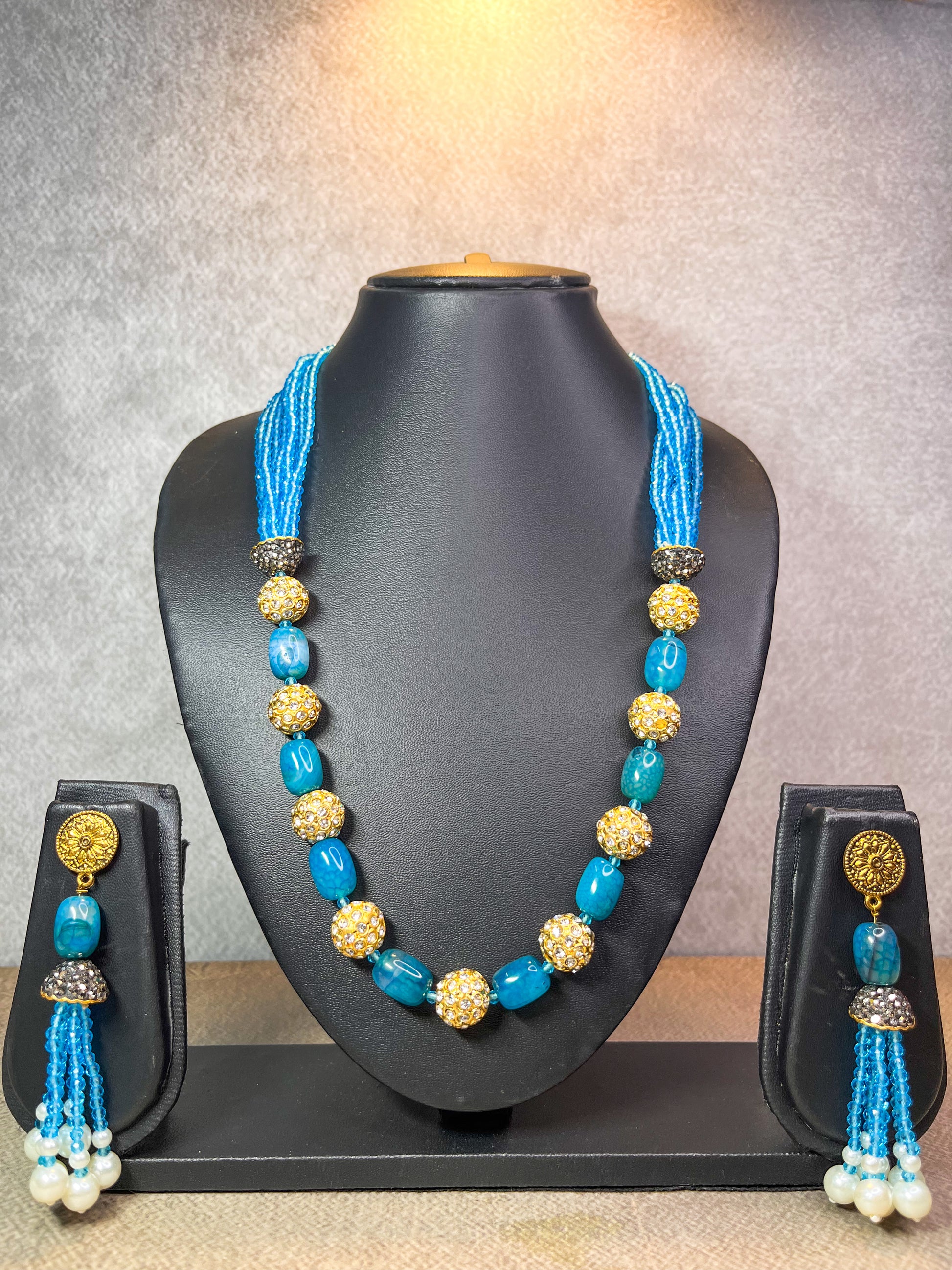 Elevate your look with this stunning Teal Blue Jaipuri Necklace Set, featuring intricate beads paired with elegant golden spheres for a touch of richness and charm. The soft finish ensures comfortable wear, while the matching statement earrings complete the look with grace.