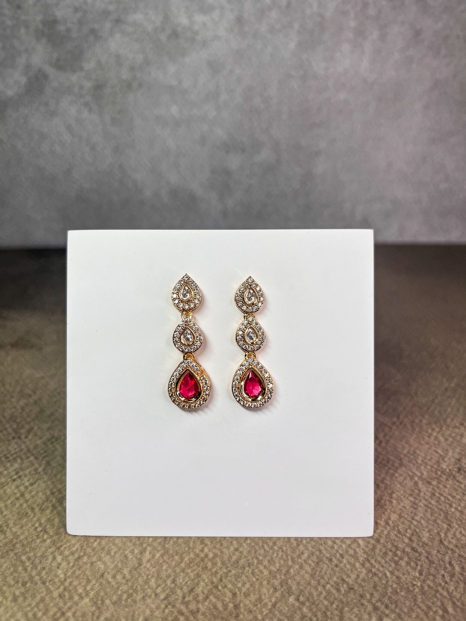 Shine bright with this moissanite-inspired necklace set, designed to add effortless sparkle to any outfit. The red and white teardrop stones paired with a finely detailed finish create an elegant statement, while the matching mid-length hanging earrings complete the look with sophistication.