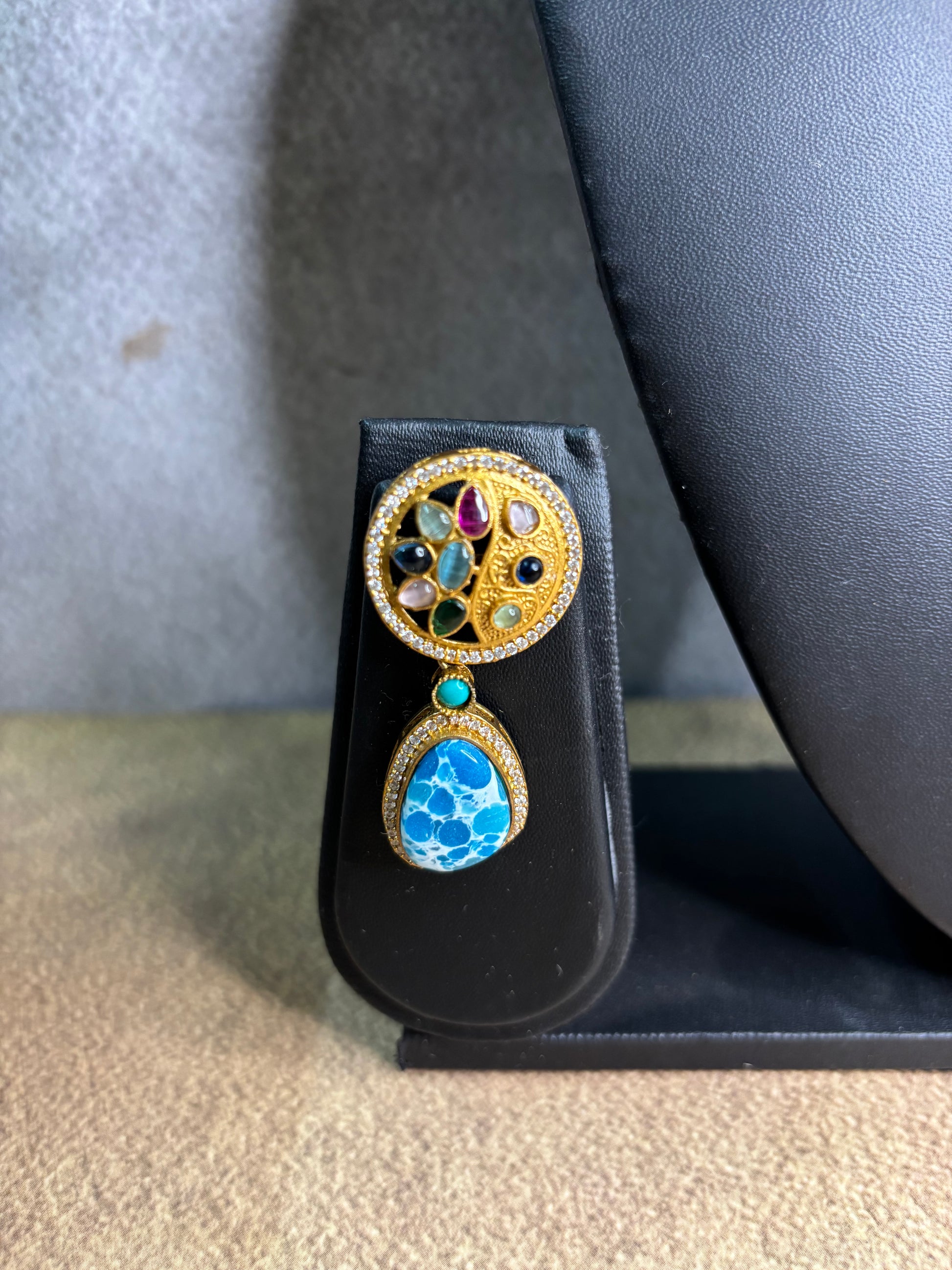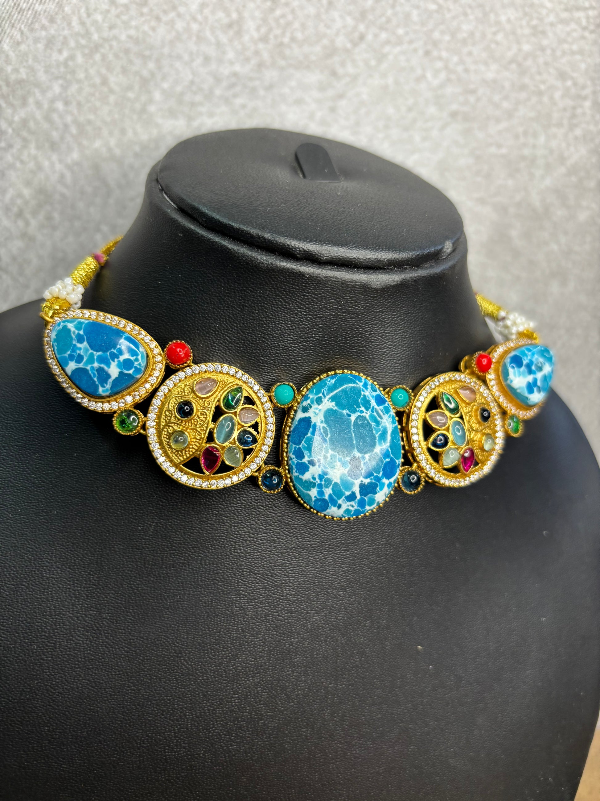 Turn heads with this vibrant and bold Ocean Blue choker necklace — a piece that effortlessly fuses traditional opulence with contemporary flair. Featuring striking marbled blue stones, set in gold-tone frames and embellished with multicolour kundan-style stones, this piece is a celebration of colour, texture, and craftsmanship.
