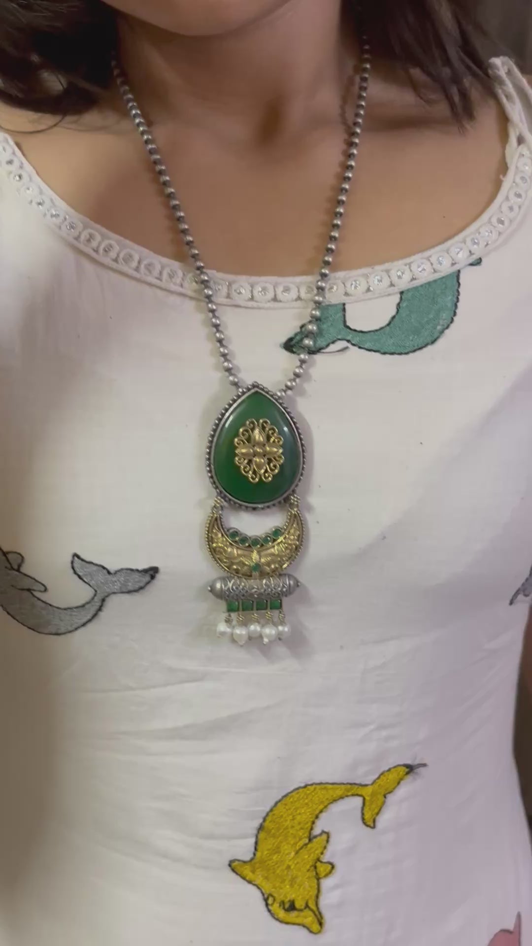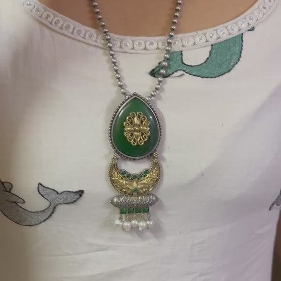 Elevate your ethnic charm with this handcrafted silver-tone necklace set featuring a striking green stone centerpiece, intricate dual-tone (silver & antique gold) detailing, and delicate pearl drops. The matching earrings complete the look, making it a perfect choice for festive occasions, weddings, or traditional gatherings.