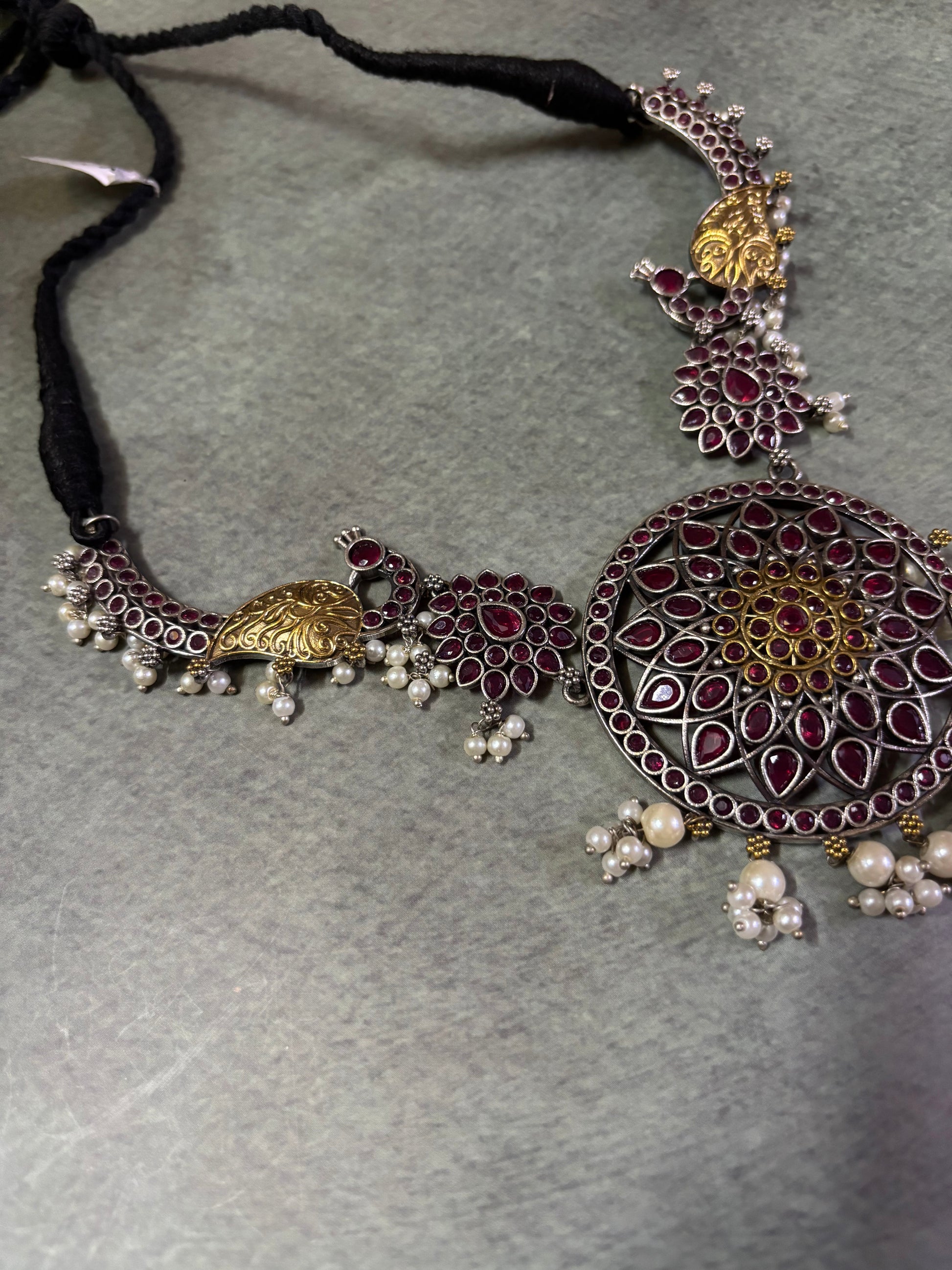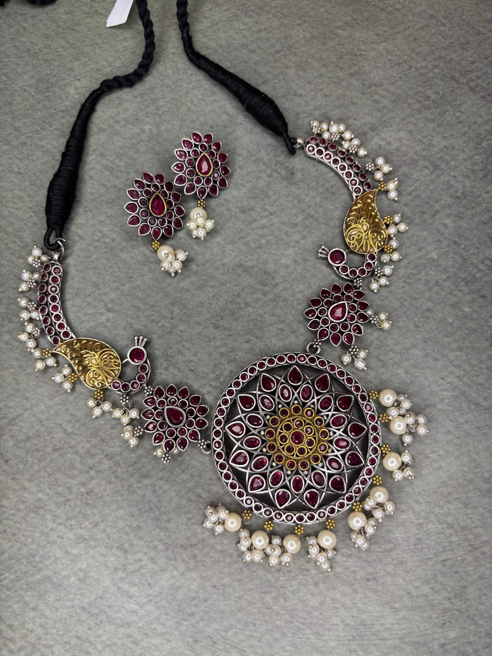This premium handcrafted silver replica set showcases a stunning mandala-inspired centerpiece with deep ruby-red stones, golden peacock accents, and delicate pearl hangings. Paired with matching floral earrings, it’s the perfect choice for weddings, festive occasions, and statement styling.