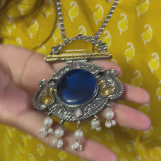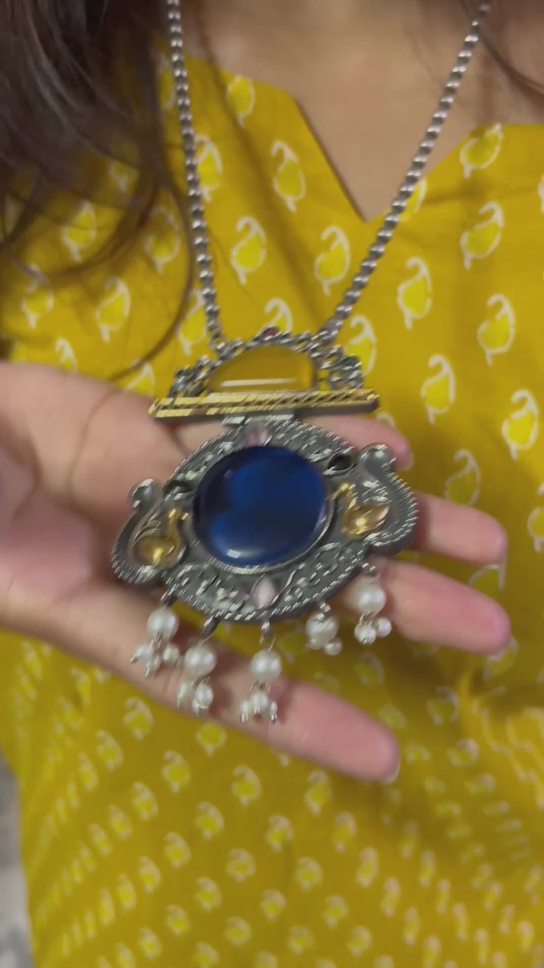 Our premium handcrafted necklace set is adorned with mustard-yellow and navy-blue monalisa stones, intricate silver detailing, and delicate pearl drops. A perfect blend of tradition and trend β whether for festive wear or everyday elegance. πππ€